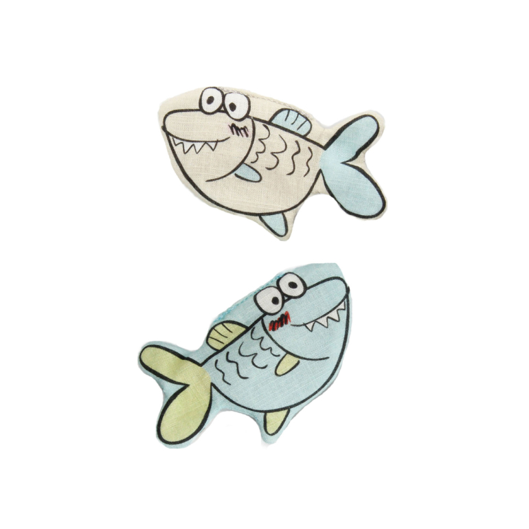 2 små bløde fisk af bomuld, fyldt med catnip og matatabi.