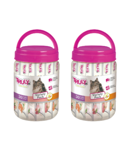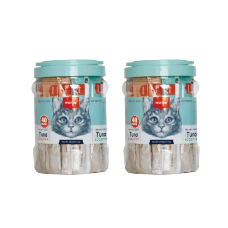SPAR! Køb 2 spande med Wanpy cremede snacks, indeholdende hele 80 tuber lækkerier. Hver spand har 40 tuber med tun & laks samt 40 tuber med tun & torsk, hvilket giver dig mulighed for at forkæle din kat med lækre smagsoplevelser.
