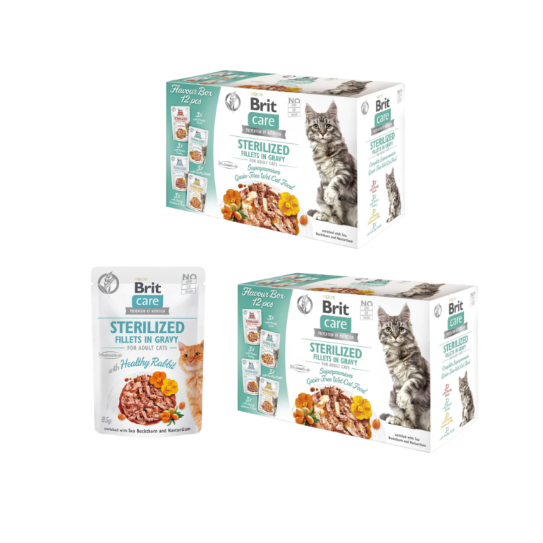 2 x Brit Care Box Fillets i sovs er fyldt med 12 poser lækker vådkost i hver æske. Kornfri komplet fuldfoder til neutraliserede (steriliserede/kastrerede) voksne katte.