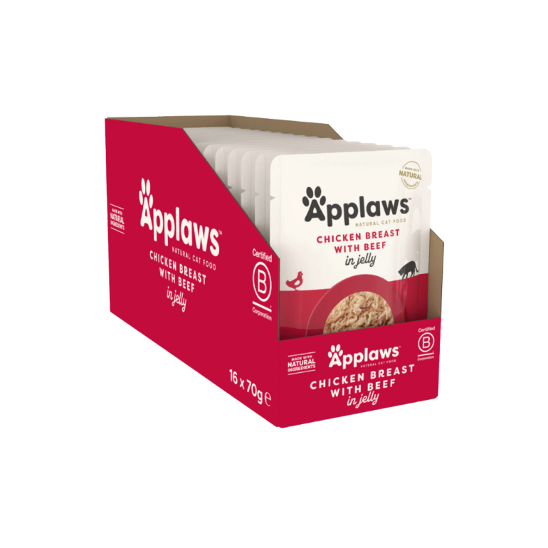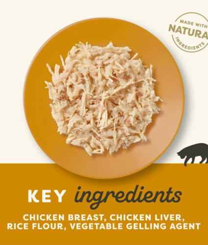 Kylling og okse i blød gele, som gør denne variant særligt velegnet til katte med følsom mund eller manglende tænder.