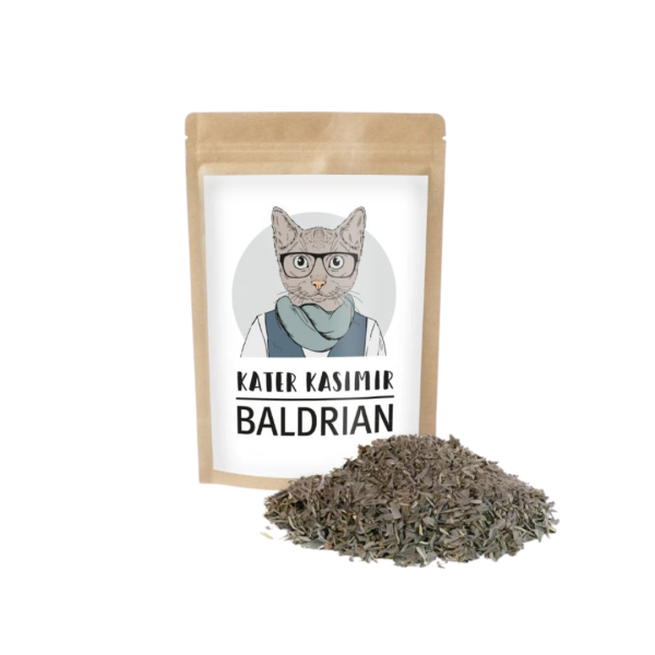 Baldrian findes ofte som en tørret rod, og er kendt for at fremkalde glæde, afslapning og legeadfærd hos nogle katte. Derfor er der også mange dyrlæger, der anbefaler, at spraye med lidt baldrian eller drysse lidt af den tørrede version i transporttasken, hvis bassen ikke bryder sig om turen til dyrlægen. Det er ofte også baldrian, der bruges i produkter, som kan berolige katten fx til nytår osv. Baldrian fås som spray og som løst baldrian til at drysse og så fås baldrian også i udvalgt kattelegetøj.