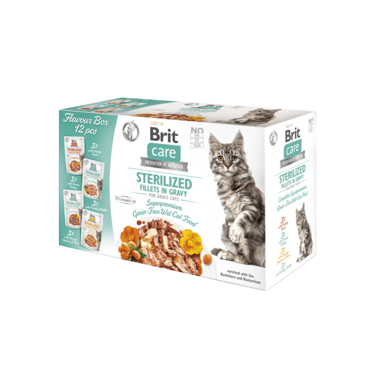 Brit Care Box Fillets i sovs er fyldt med 12 poser lækker vådkost. Kornfri komplet fuldfoder til neutraliserede (steriliserede/kastrerede) voksne katte.