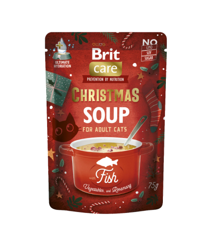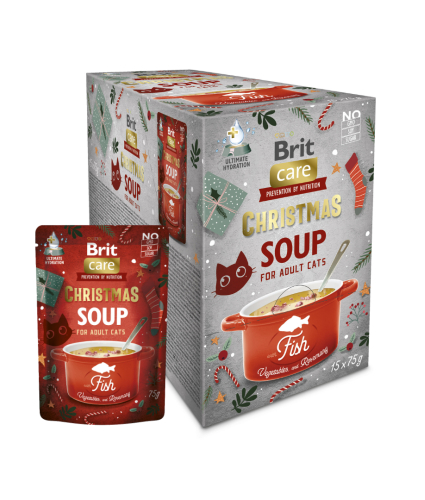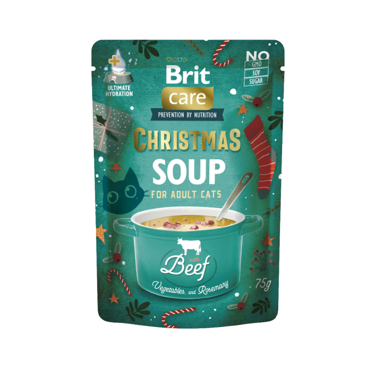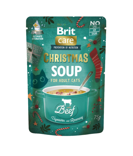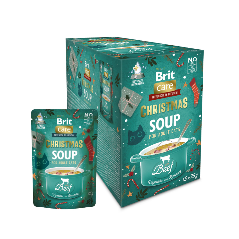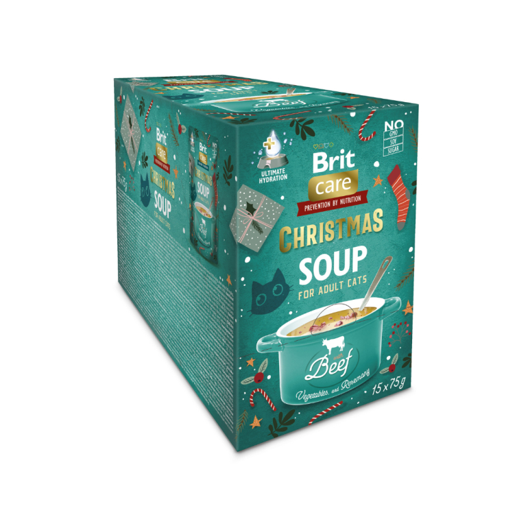 Brit Care Christmas Soup, 1 æske med 15 poser suppe m/bøf. Prøv den skønne julesuppe til voksne katte, der indeholder lækker bøf, friske grøntsager og aromatisk rosmarin. Køb en hel æske og få mængderabat! Hver æske indeholder 15 poser á 75 gram, perfekt til at forkæle din kat denne jul.