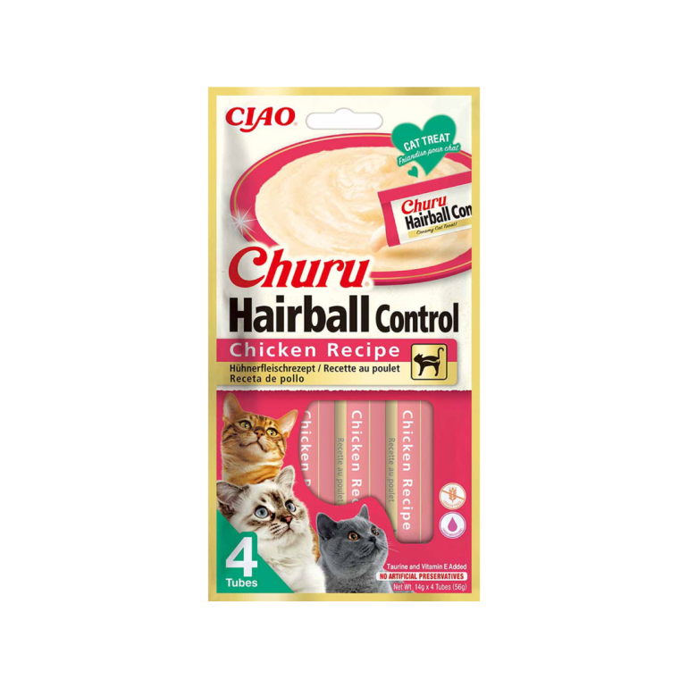 Hjælp med at forhindre hårboller med de velsmagende og cremede snacks fra Churu. Pakket med uopløselige fibre, der hjælper med at kontrollere hårboller, samtidig med at det er en kaloriefattig godbid med højt vandindhold for din kats generelle sundhed.