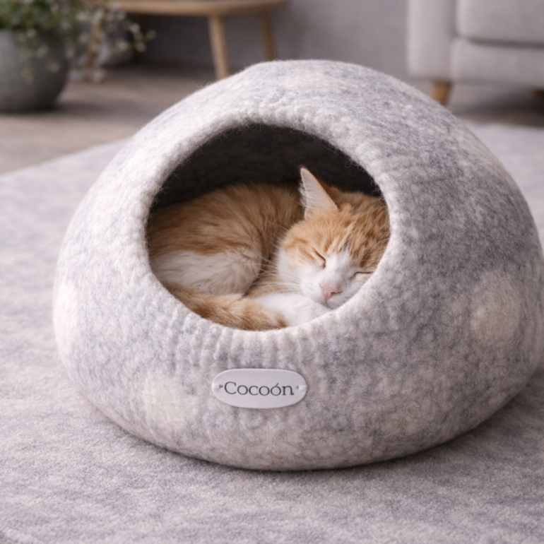 Hyggelig håndlavet kattehule i lysegrå uld med hvide polkaprikker.