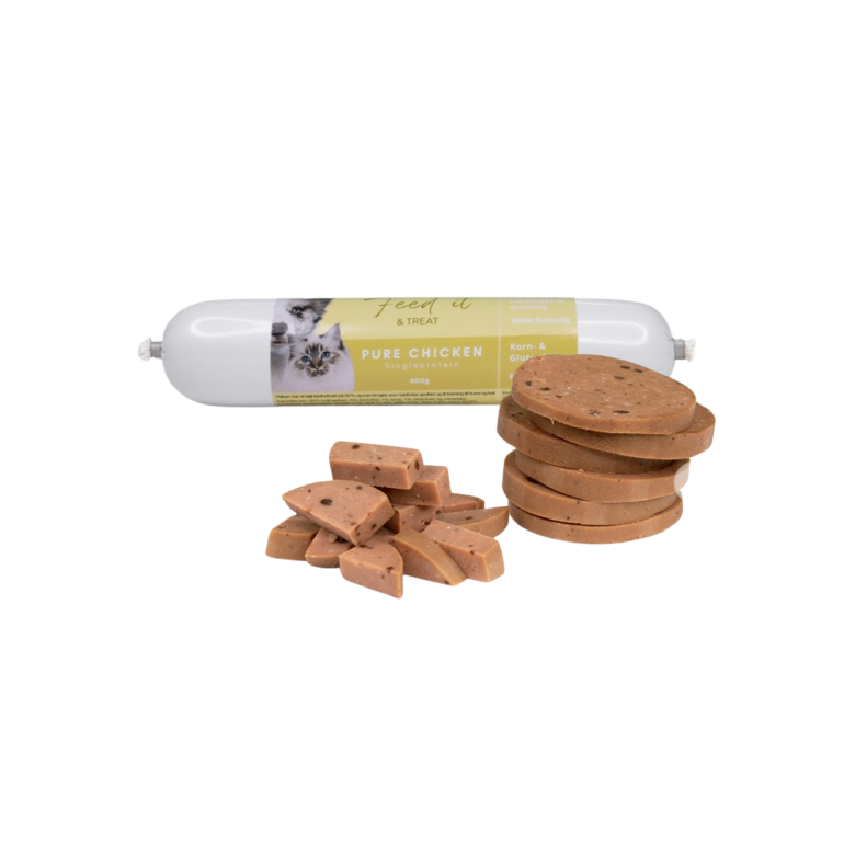 Smagfuld pølse med hele 92% kylling. Kan nemt skæres i mindre tern og bruges som snacks eller topping på kattemaden for at give variation og ekstra smag. Pølsen indeholder 400 gram.