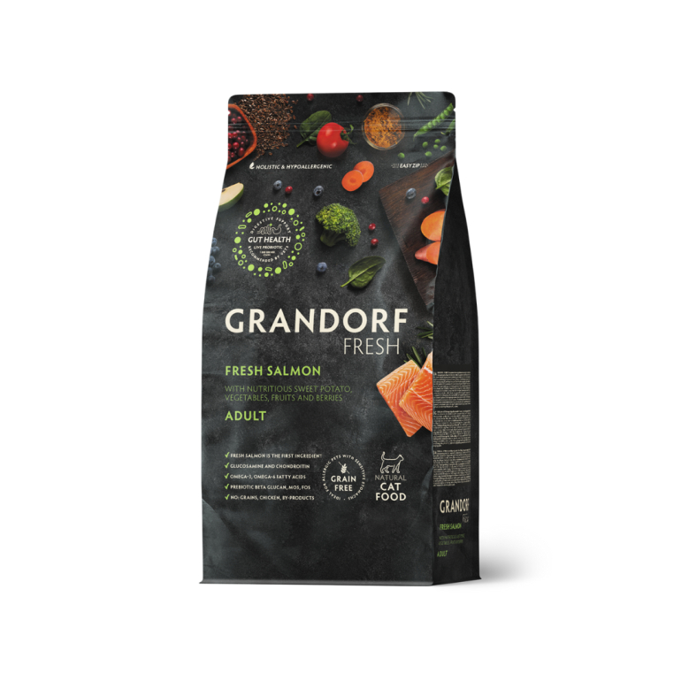 Laks er naturligt rig på essentielle aminosyrer samt omega 3 og 6 fedtsyrer, som bidrager til sund hud og en stærk, skinnende pels. Søde kartofler fungerer som en letfordøjelig kulhydratkilde og erstatter korn ved foderintolerancer. Levende probiotika understøtter en sund tarmflora og hjælper katten med at udnytte næringsstofferne optimalt. Grandorf Fresh Salmon kombinerer høj smagelighed med ernæringsmæssig balance og er et ideelt valg til den kræsne eller følsomme kat.