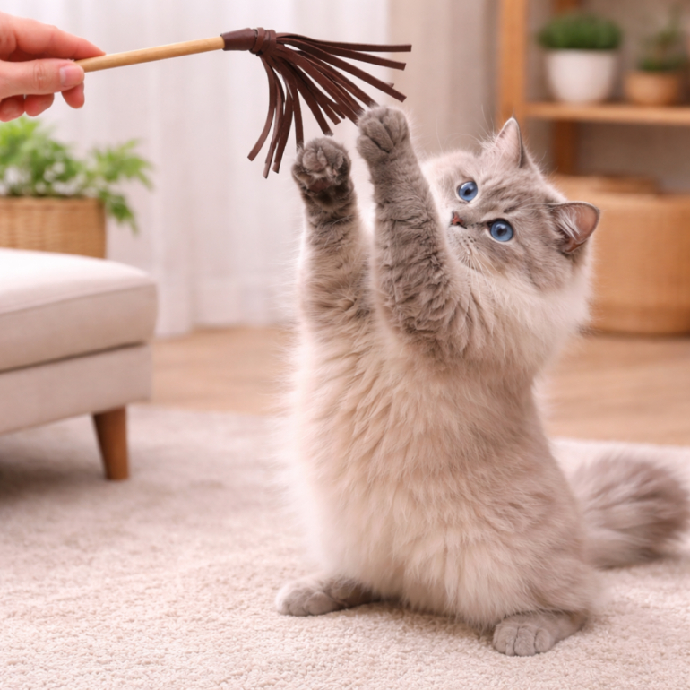 Naturlig drillepind af bøgetræ og læderfrynser. Mange katte elsker duften af ægte læder, og når det så sidder på en pind, der kan stimulere jagtinstinktet i katten, så er der næsten garanteret en sand fest!