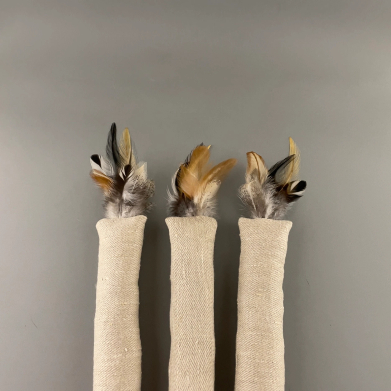 Den håndlavede pude er lavet af yderst slidstærkt hampstof, fyldt med naturlig uld og catnip, som kan få enhver kat op på dupperne. Fjerene i den ene ende kommer fra en lille lokal gård, og er fastholdt indeni med naturlig bivoks for bedre robusthed. Katte elsker at fastholde deres "bytte" med forpoterne og sparke løs med bagbenene. Det er denne kicker stærk nok til, så lad bare din kat gå bananas.