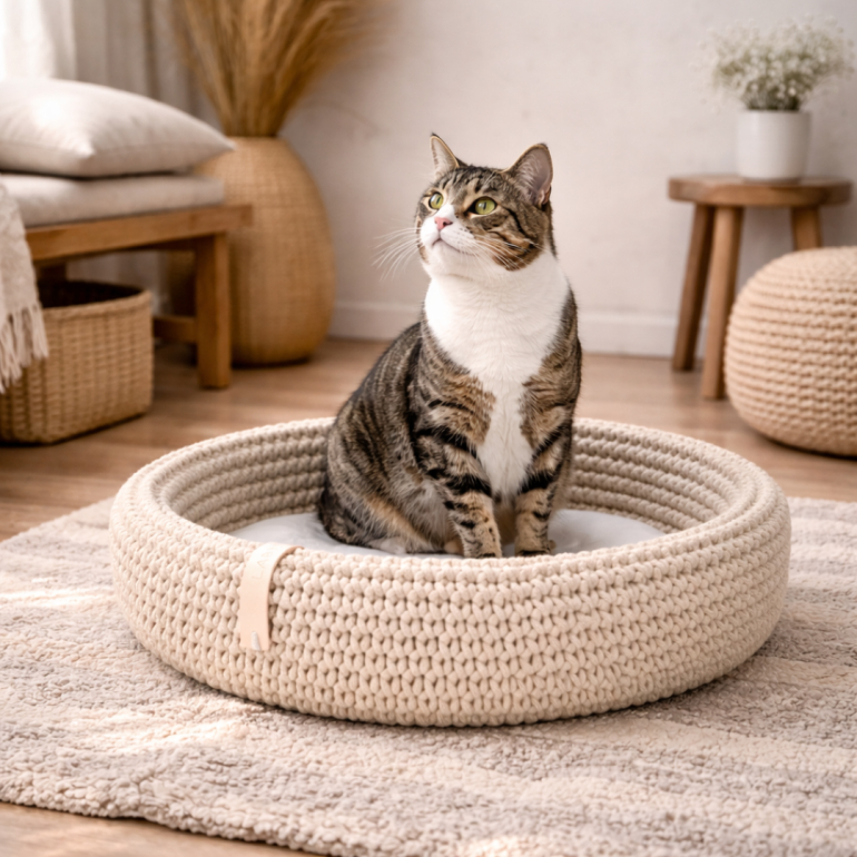 Coco Basket: En oase af komfort og stil designet til din elskede kat. Denne håndhæklede kurv er omhyggeligt fremstillet af Oeko-Tex bomuldsreb af høj kvalitet og tilbyder et luksuriøst tilflugtssted for katte.