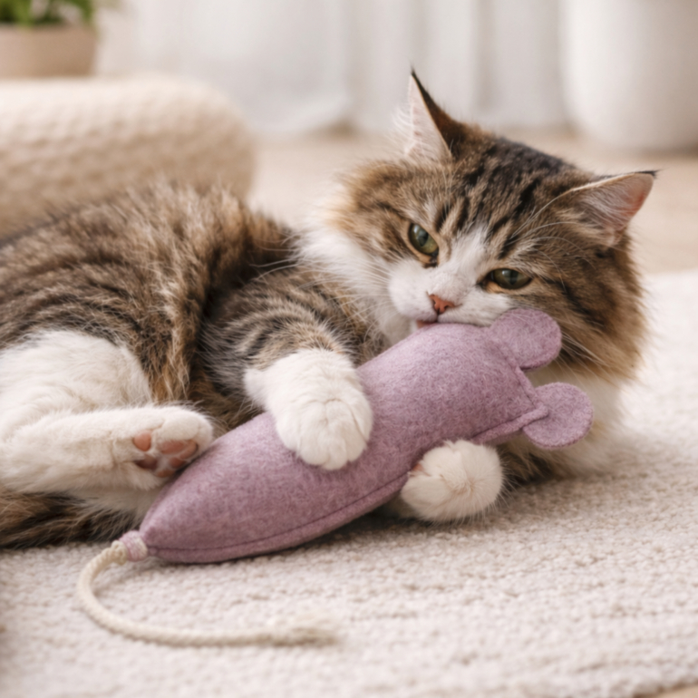 Håndlavet filtmus af ren uld fyldt med beroligende baldrian, der får din kat til at elske at putte med sin nye muse-ven!
