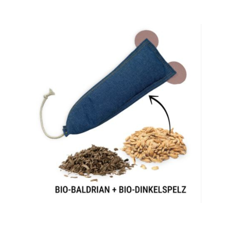 25 cm. lang "sparkemus" af jeansstof med okselæder-ører og fyldt med duftende baldrian urter og speltskaller.
