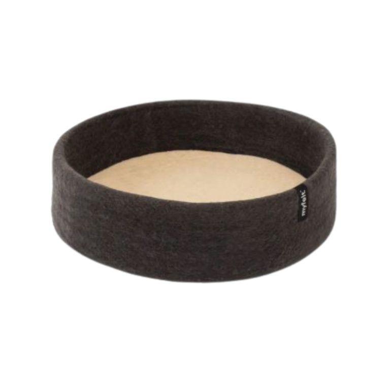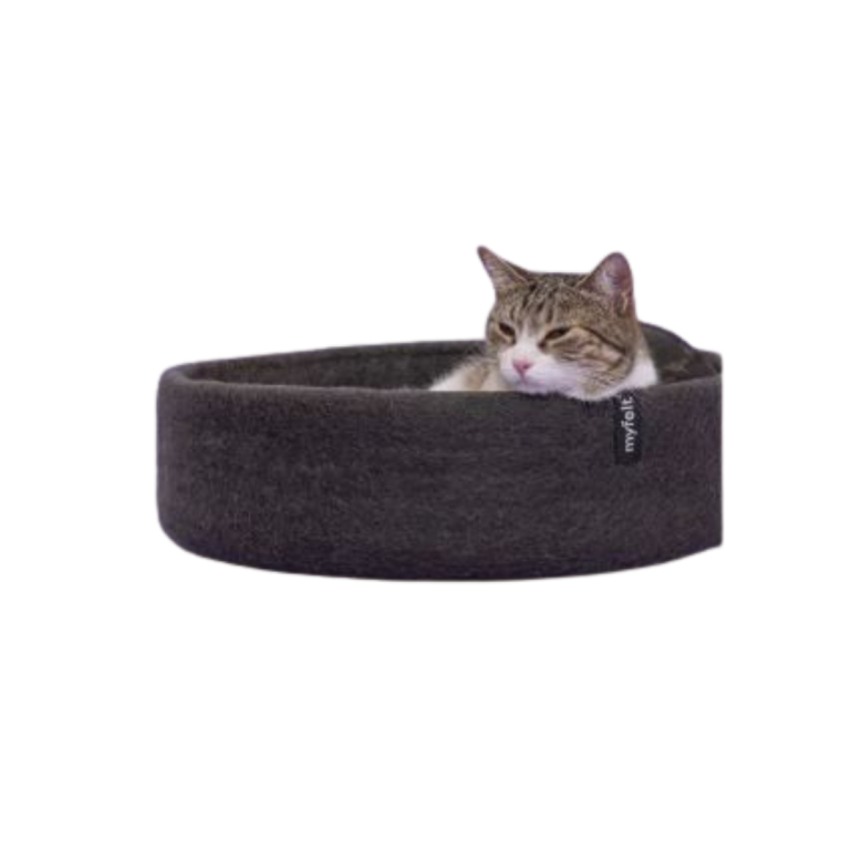 Farve: Mørkegrå kurv med løs naturhvid uldhynde. Hynden kan fjernes, hvis du ønsker, at kurven skal være helt ensfarvet grå. Inderhynden kan bruges separat et sted, hvor din kat også ynder at putte.