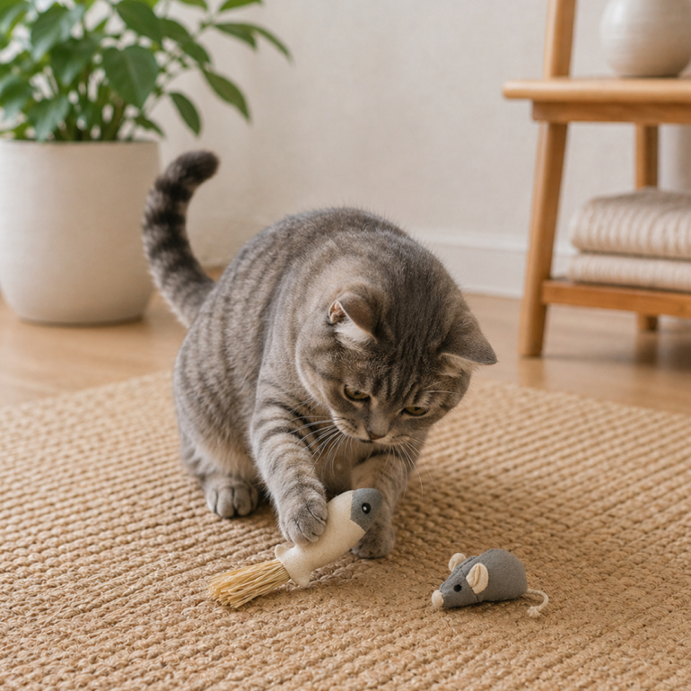Gots certificeret kattelegetøj med katteurt og knitrende basthale.