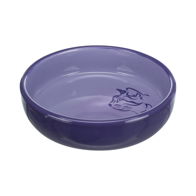 Specialdesignet kattemadskål (eller vandskål) af keramik med en smuk højglans overflade i farven lilla.