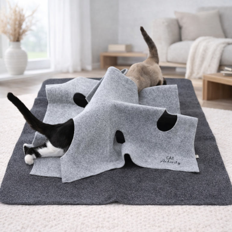 Stort justérbart aktivitetstæppe af filt til din kat.