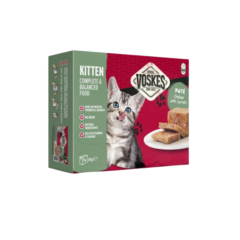 Voskes paté med kylling og gulerødder til killinger. Denne cremede og lækre paté med kylling (40%) og fine stykker gulerod er et komplet vådfoder til killinger i vækst. Patéen indeholder 100% naturlige ingredienser, er helt kornfri og rig på taurin, vitamin A & E og animalske proteiner. Der er tilføjet krillmel, som en kilde til høj kvalitetsproteiner og essentielle fedtsyrer.