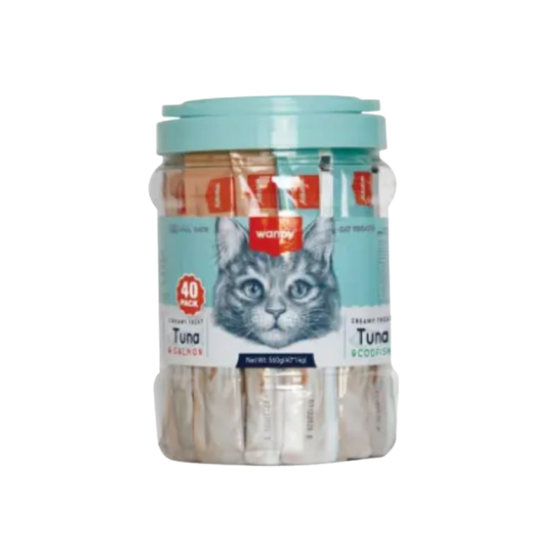 Spand med 40 tuber cremede snacks á 14 gram. 20 stk. med tun & laks, 20 stk. med tun & torsk.