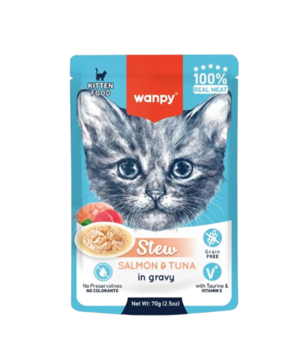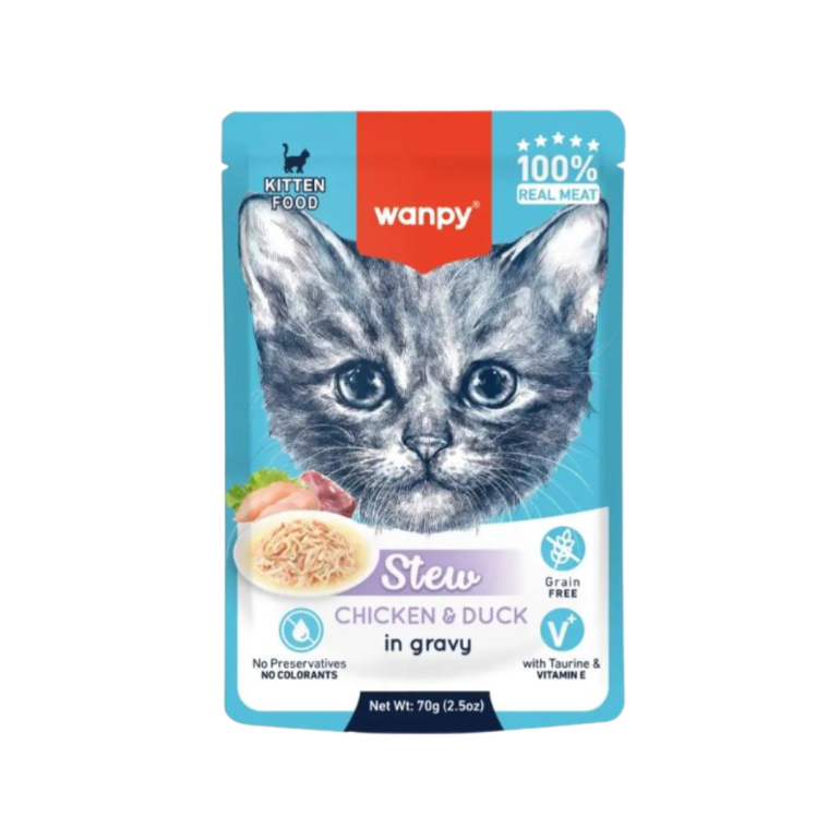 Wanpy Stew Kitten med kylling og and i lækker sovs er 100% ægte kød og helt uden korn, farvestoffer eller konserveringsmidler.