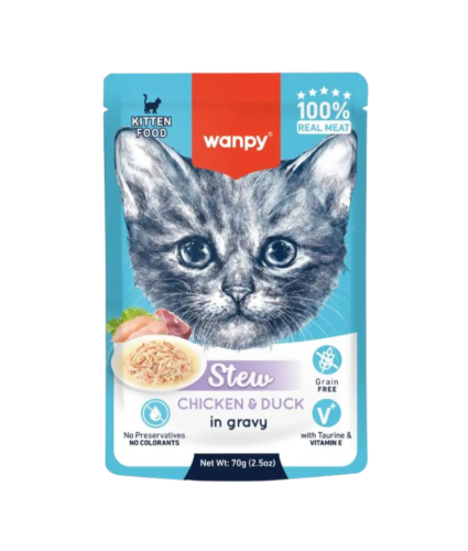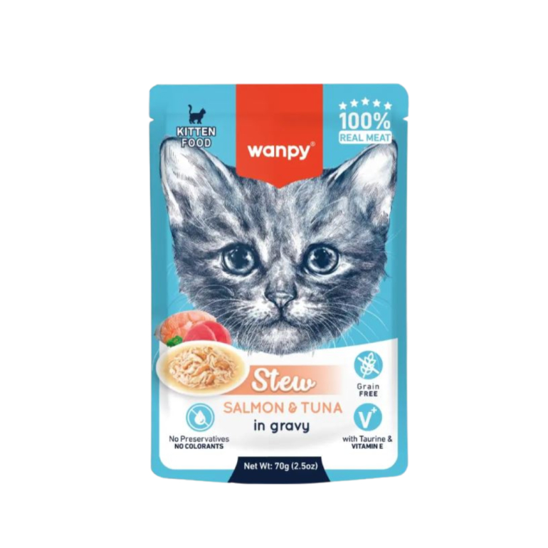 Wanpy Kitten Stew med laks og tun i lækker sovs er 100% ægte kød og helt uden korn, farvestoffer eller konserveringsmidler.