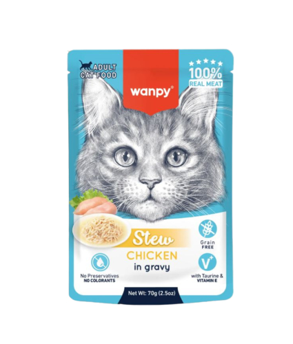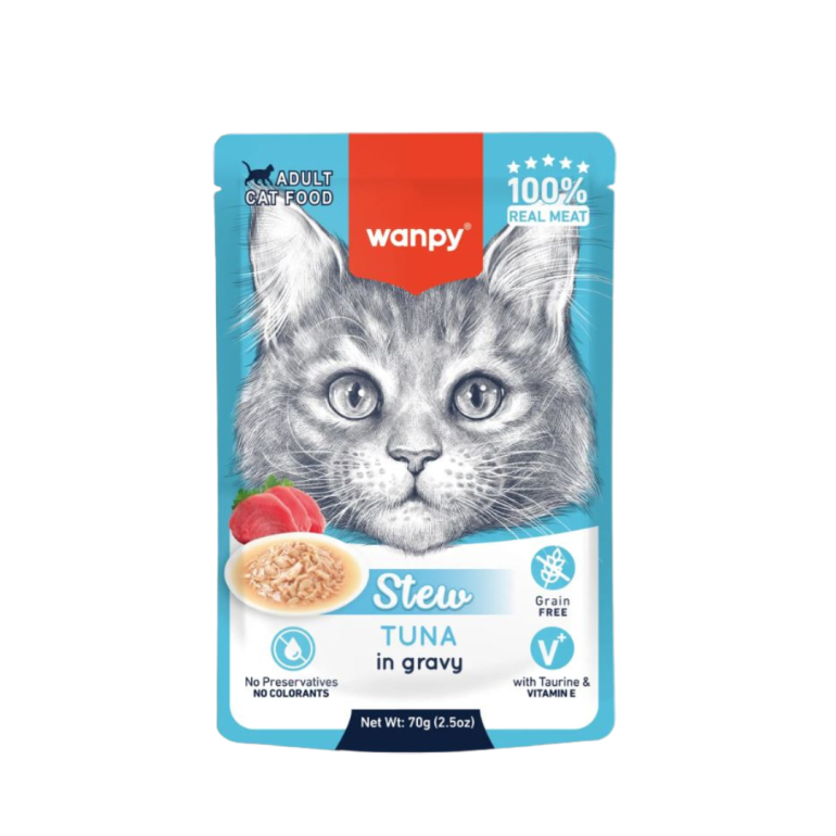 Wanpy Cat Stew med tun i lækker sovs er 100% ægte kød og helt uden korn, farvestoffer eller konserveringsmidler.